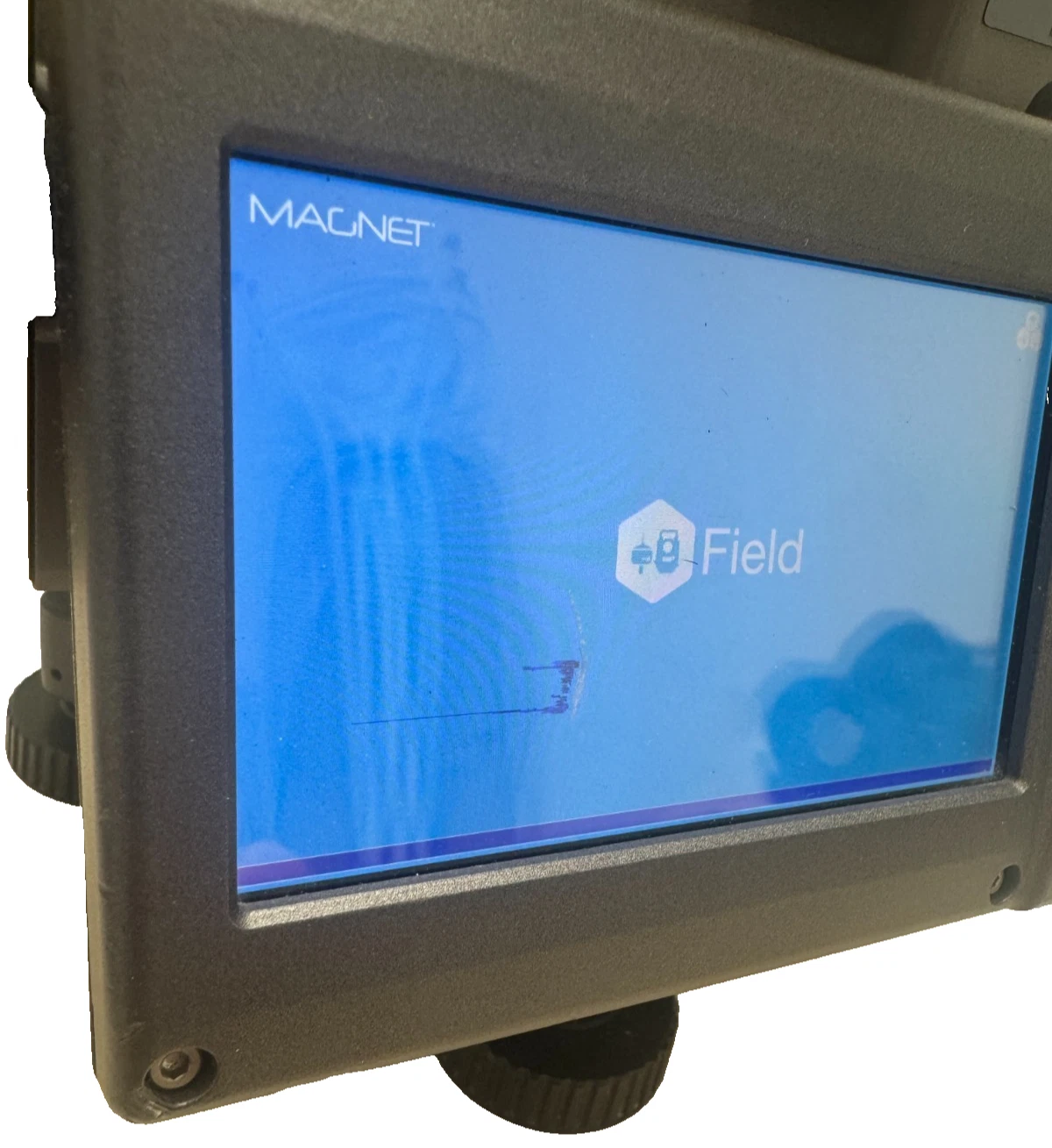 This used Topcon GT-603 Robotic Total Station powers on normally and boots fully into MAGNET Field. The instrument is functional for field use, however the screen presents a visible defect and one minor component shows physical damage — both are documented in the product photographs and should be reviewed before purchase. Cosmetic wear is consistent with professional field deployment, and the unit was calibrated in 2025.